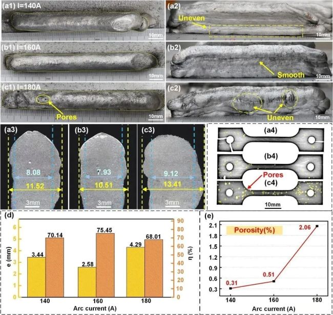 图4 沉积薄壁件的宏观成形及孔隙情况,(a1-a4) I=140A;(b1-b4) I=160A;(c1-c4) I=180A;(d) 成形特征统计数据;(e) 孔隙率统计数据