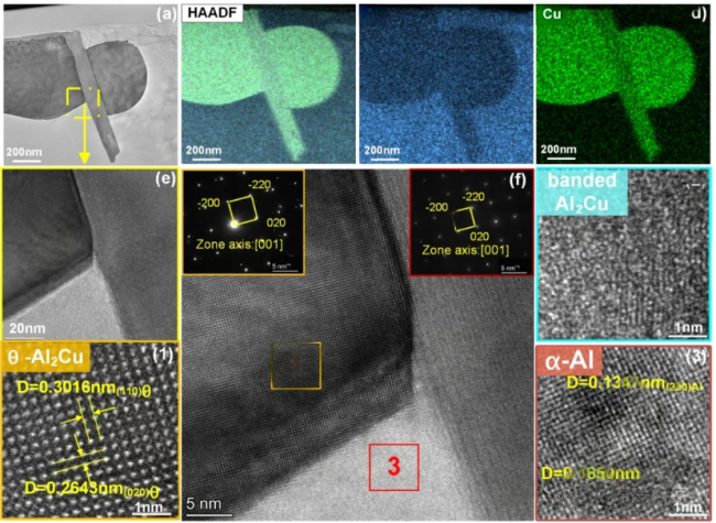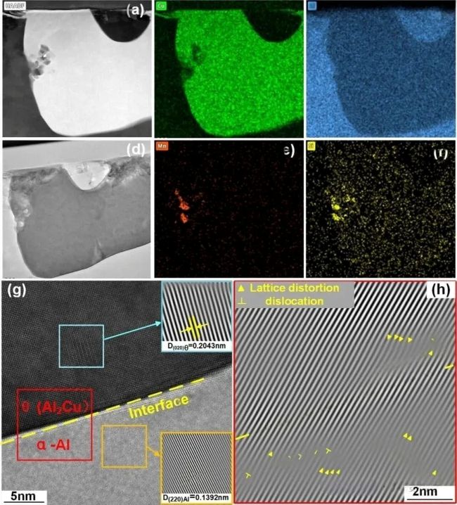 图11 透射电子显微镜(TEM)观察到的试样显微组织:(a-f) θ相的形貌及化学成分;(g-h) 对应Al₂Cu相界面高分辨透射电子显微镜(HRTEM)图像的逆快速傅里叶变换(IFFT)重构图