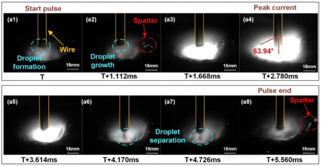 图7 高速相机观察到的电弧行为,(a1-a8) I=180A