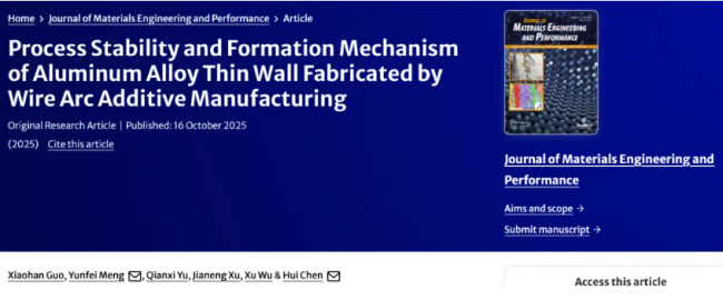2025年10月16日,西南交通大学材料科学与工程学院的研究团队在《Journal of Materials Engineering and Performance》期刊发表最新研究文章“Process Stability and Formation Mechanism of Aluminum Alloy Thin Wall Fabricated by Wire Arc Additive Manufacturing”,研究了电弧电流对2319铝合金薄壁件电弧增材制造(WAAM)的工艺稳定性、形成机理及力学性能的影响,确定了最优电弧电流参数。本期谷·专栏将对该研究成果进行简要分享。