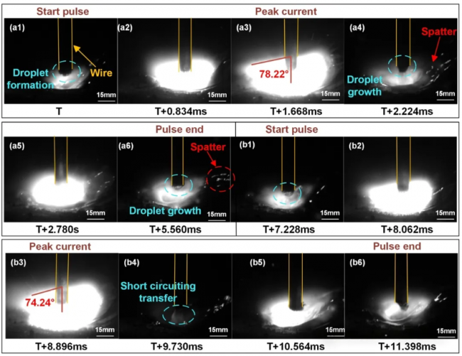 图5 高速相机观察到的电弧行为,(a1-b6) I=140A