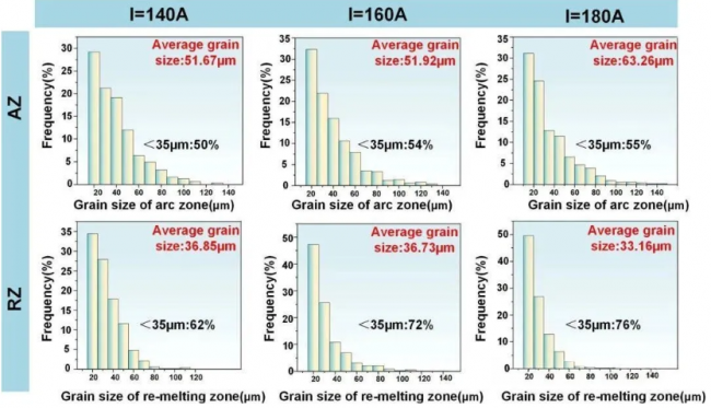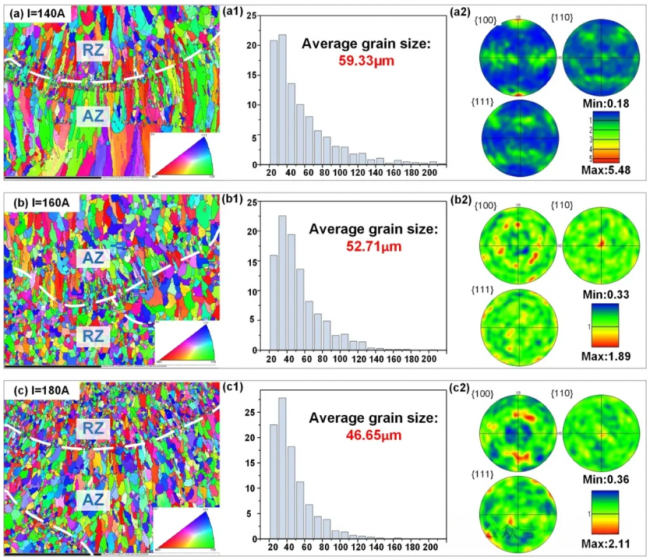 (3)随着电弧电流增大,热输入增加,导致电弧熔化区(AZ)晶粒尺寸增大,而重熔区(RZ)晶粒细化。较高的电流促进晶粒细化、柱状晶向等轴晶转变,并降低晶粒取向集中度,表明等轴晶形成能力增强。