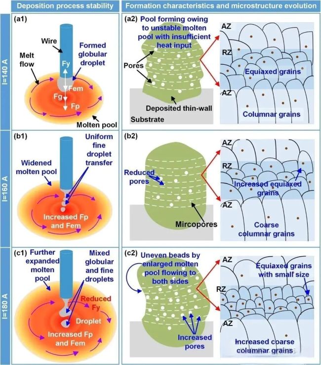 图17 电弧电流对电弧增材制造铝合金的影响机理,(a1-a3) I=140A;(b1-b3) I=160A;(c1-c3) I=180A