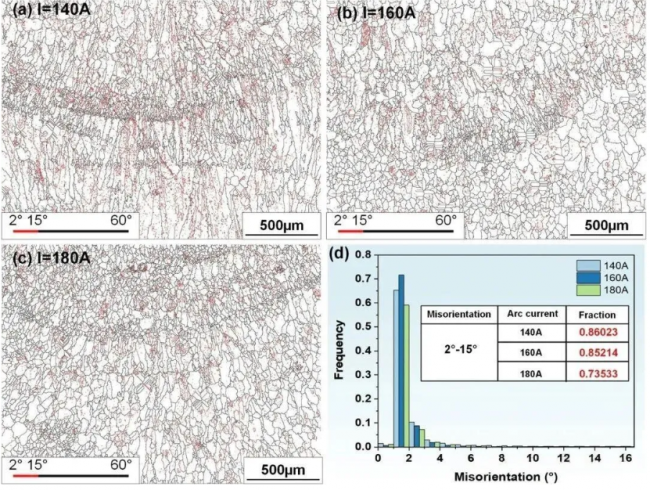 图14 低角度晶界(LAGBs)和高角度晶界(HAGBs)的分布情况,(a) I=140A;(b) I=160A;(c) I=180A;(d) 低角度晶界统计结果