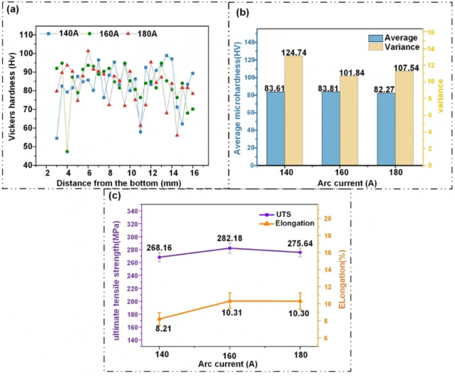 (4)160A时,显微硬度分布更均匀,抗拉强度和伸长率达到峰值,分别为282.18MPa和10.31%,较140A时分别提升5.23%和25.58%。180A时,尽管伸长率仍保持较高水平,但由于孔隙率增加,抗拉强度略有下降,凸显了过大电流对力学性能的不利影响。