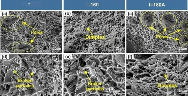图16 不同电弧电流下拉伸试样的断口形貌,(a,d) I=140A;(b,e) I=160A;(c,f) I=180A