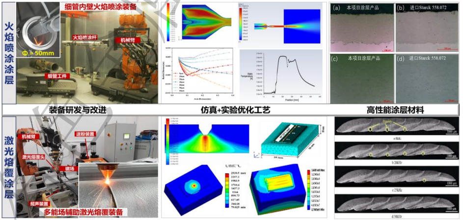 · 专用涂层工艺与装备:开发窄径管(≤50mm)内壁超音速火焰喷涂技术与装备;研制多能场辅助激光熔覆系统,攻克大幅面涂层易开裂难题;结合有限元模拟多场耦合仿真技术,实现了高致密度(≥99%)、高硬度(≥1200HV)、高结合力(≥580MPa)的含钨及钨基涂层工艺的全流程优化。